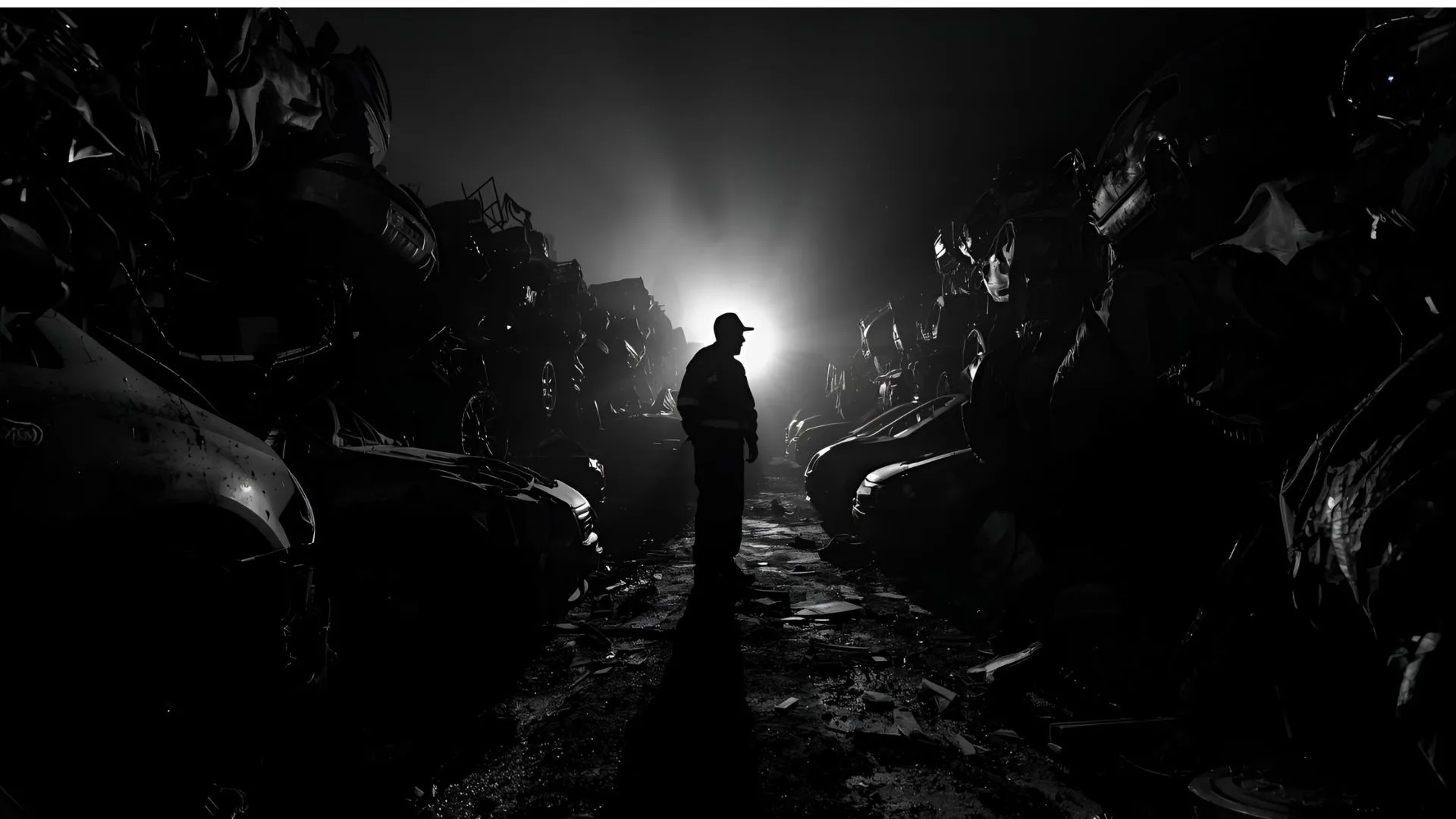 A dramatic black-and-white shot showing the silhouette of a scrapyard worker standing in the middle of stacked, crushed cars. The bright light behind the worker creates a striking contrast, highlighting the gritty and intense atmosphere of life inside a UK scrapyard.