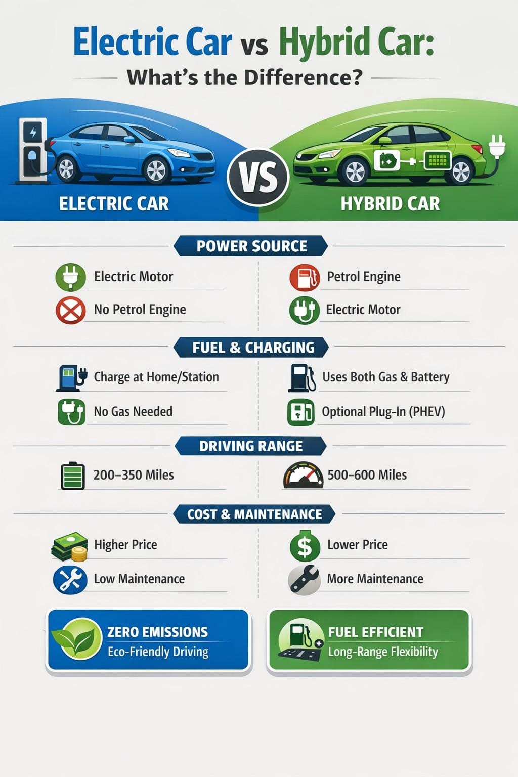 Both are marketed as fuel-efficient, eco-friendly alternatives to petrol cars, but they work very differently, cost differently, and suit different driving needs.