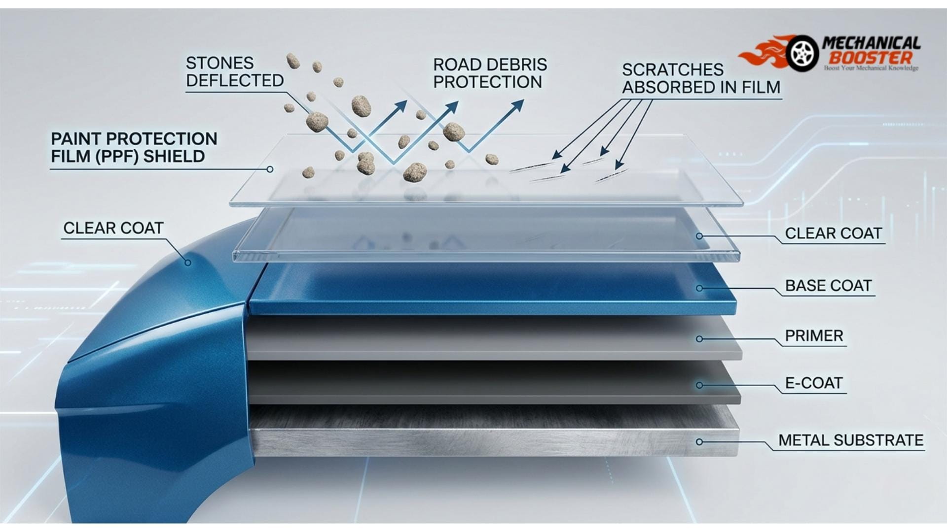 PPF protects the vehicle surface from minor scratches, stone chips, and road debris by acting as a physical barrier that prevents direct damage to the original paint.